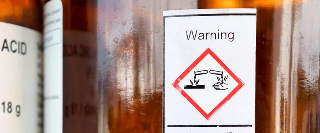 Le pictogramme SGH05 signale les substances corrosives capables de détruire les tissus vivants (peau, yeux, muqueuses) et/ou d’endommager les métaux.