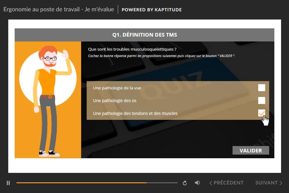 Mauvaises installations, mouvements répétitifs ou inadaptés, positions maintenues sur une longue période sont susceptibles de provoquer des Troubles Musculo Squelettiques (TMS) qui sont ainsi, en France, devenus la première cause de maladie professionnelle reconnue. Les TMS touchent tous les secteurs d’activité y compris tertiaires et constituent actuellement un problème majeur de santé au travail. Pour limiter le risque de TMS et la fatigue visuelle associée au travail sur écran, il faut apprendre à aménager son poste de travail, repérer les bonnes postures et s’entrainer à alterner les activités.
