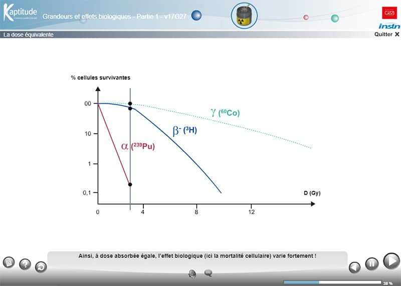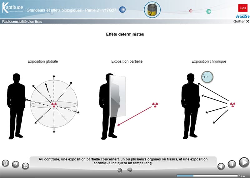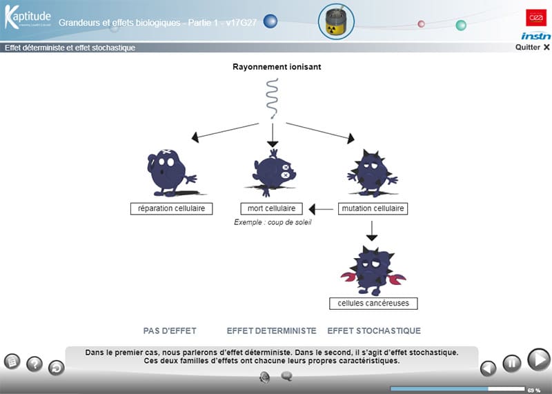 Les grandeurs de radioprotection sont ici résumées en incluant la dose équivalente et la dose efficace ainsi que les facteurs de pondération associés. Les effets biologiques des rayonnements ionisants sont étudiés au niveau cellulaire, moléculaire et tissulaire. Ils sont expliqués chronologiquement en suivant les cheminements possibles dans une cellule exposée puis en distinguant les deux catégories d’effets : déterministes et stochastiques.
