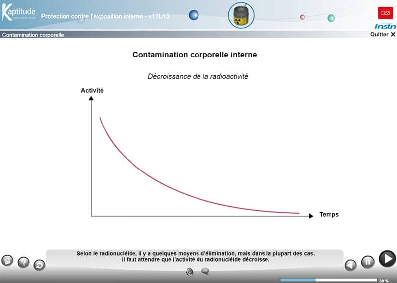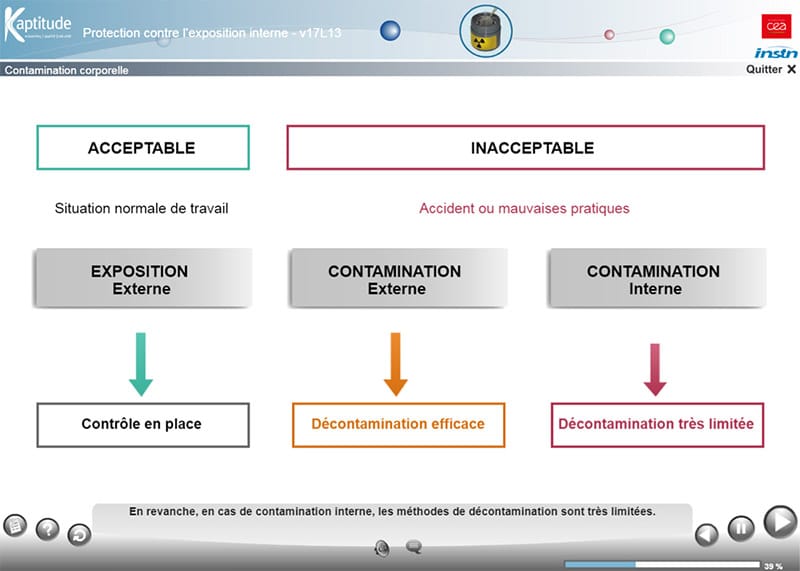 Si l’exposition externe pour un manipulateur peut relever d’une situation normale de travail lorsqu’elle est contrôlée, ce n’est pas le cas de la contamination, qu’elle soit externe ou interne. Un renversement accidentel d’une source non scellée peut être à l’origine d’un tel problème et les moyens de décontamination sont très limités pour une contamination interne. Il est important de comprendre le devenir des substances radioactives dans l’organisme et la notion de dose efficace engagée. Enfin, pour faire le tour de la question, la connaissance des principes de protection et de contrôle est indispensable.
