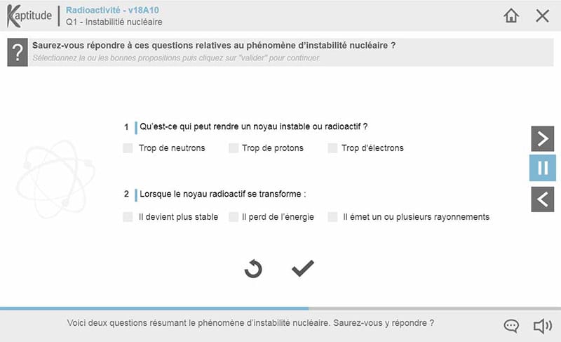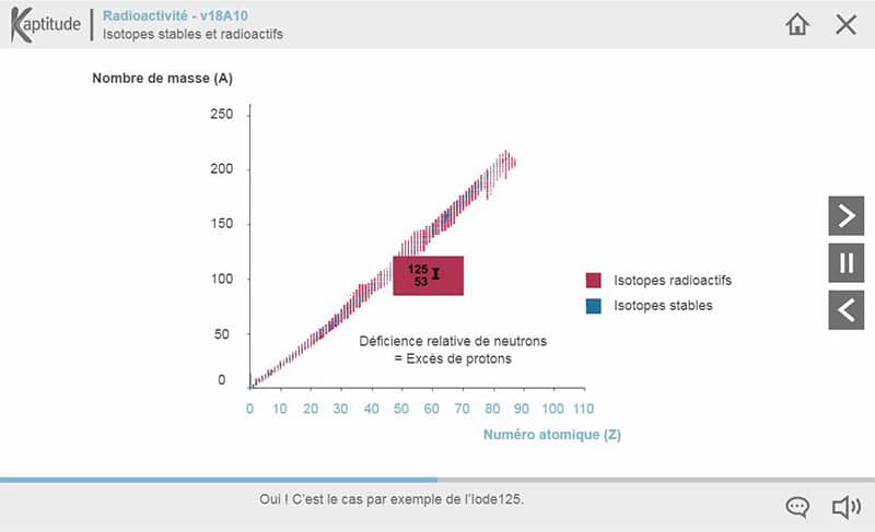 La notion de noyaux radioactifs et de transformations radioactives est abordée en introduction pour expliquer les trois grandes familles de désintégrations β+, β-, α à partir de la répartition des isotopes en fonction du nombre de masse et numéro atomique. Puis, sont introduites les grandeurs de radioactivité : l’activité et ses unités de mesure Becquerel et Curie, et la période d’une source expliquant le phénomène de décroissance radioactive.